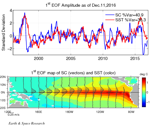 We use the near real-time surface current (SC) output from the diagnostic model to monitor the evolution of the El Niño/Southern Oscillation (ENSO) signal in the tropical Pacific Ocean. The SC anomaly variations, with the seasonal climatology removed, have a very strong ENSO signal as seen in their principal empirical orthogonal function (EOF) and its comparison with the EOF of the sea surface temperature anomaly (SST). This figure portrays the first EOF mode of SC and SST anomalies for the past decade extending through the latest 10-day period. The amplitude time series (top panel) are computed by fitting the data sets to 10-year base period eigen vectors (1993-2002) The amplitudes are then normalized by their respective standard deviations. The bottom panel shows the corresponding EOF maps, scaled accordingly. The El Niño signal can be seen as periods of positive excursions (> 1 Std. Dev.) of the amplitude time series.