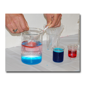 Mix small amounts of the dye and corn syrup in separate containers. These will be the color patches inserted into uncolored corn syrup. Don’t use the liquid dye – it will change the density of the colored drops too much.