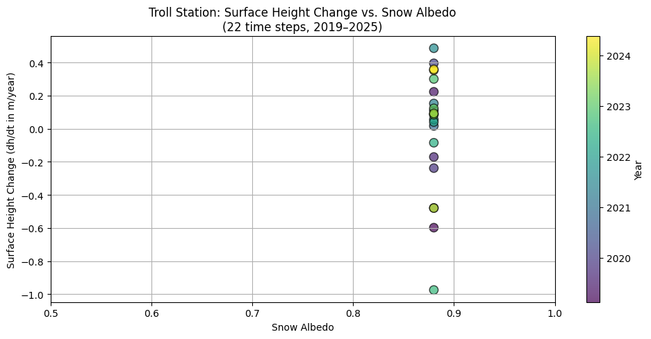 To explore my research question, I focused on Troll Station, a Norwegian research base in East Antarctica. I took surface height change measurements from NASA’s ICESat-2 satellite (ATL15 product), which uses laser pulses to measure ice elevation. For snow albedo, I used Copernicus ERA5, a global reanalysis dataset that combines observational data with weather prediction models. Using Python and tools like xarray, matplotlib, and pandas, I created time series graphs to visualize changes in both variables. I also generated a scatter plot and map plot to check the snow albedo value.