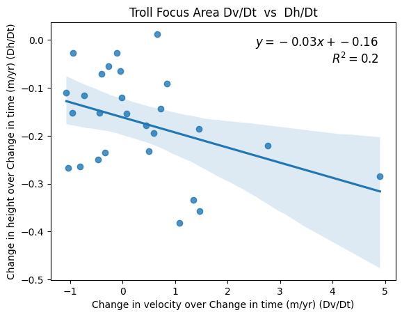 For my results, the scatterplot shows a weak negative correlation between Dh/dt and Dv/Dt in the Troll Focus Area. This suggests that faster ice flow may be loosely associated with greater thinning, which is consistent with known patterns of dynamic thinning. However, because the datasets only overlapped for a single year, it’s unreasonable to make strong generalizations. Short-term variations, noise in the data, and time scale mismatches could all influence this trend. Despite this, the result shows the potential of using velocity as a way to cross-check elevation measurements, and to highlight areas where ice might be stretching, accelerating, or responding to shifts in mass balance. It allows for deeper analysis as more years of data become available.